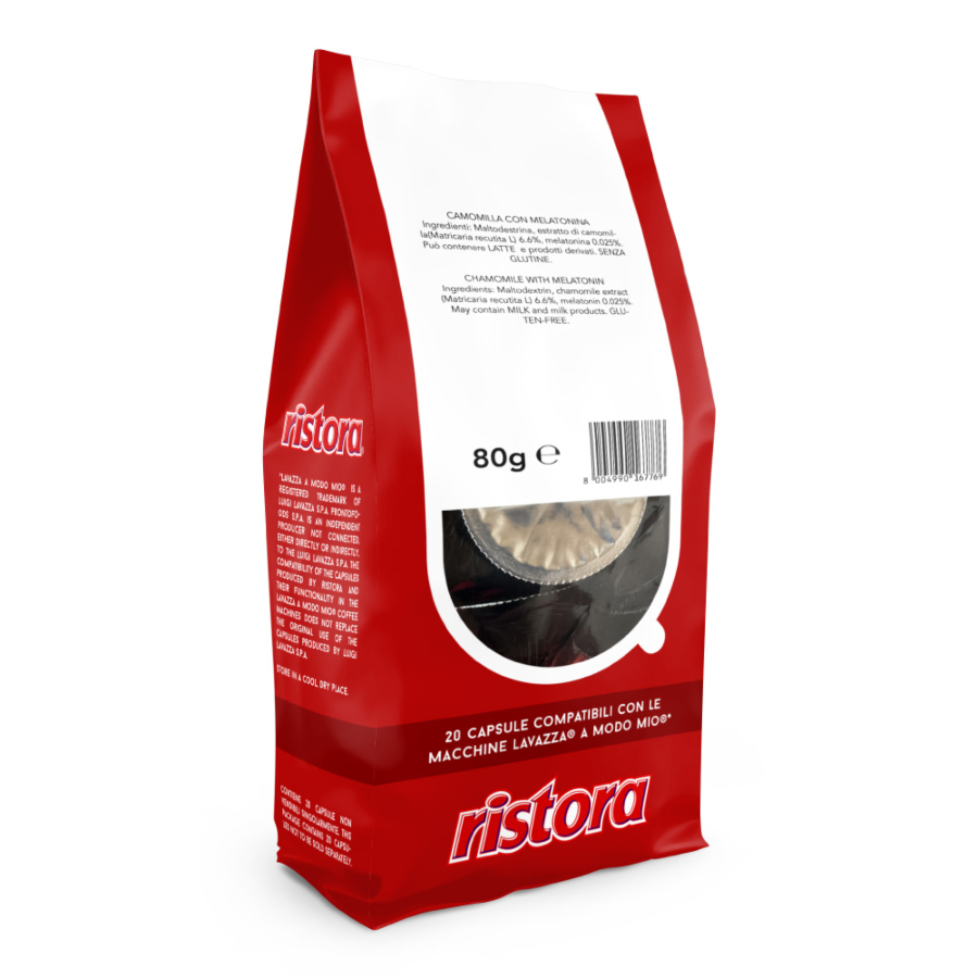 La camomilla alla melatonina Ristora unisce le proprietà calmanti della camomilla con i benefici della melatonina, per un rilassamento ottimale. Questa bevanda è ideale per aiutarti a rilassarti e a favorire un sonno sereno. Ogni sorso è un invito alla tranquillità e al benessere, perfetto per chiudere la giornata in pace.INGREDIENTImaltodestrina, estratto di camomilla(Matricaria recutita L) 6.6%, melatonina 0.025%. Può contenere LATTE e prodotti derivati. SENZA GLUTINE.